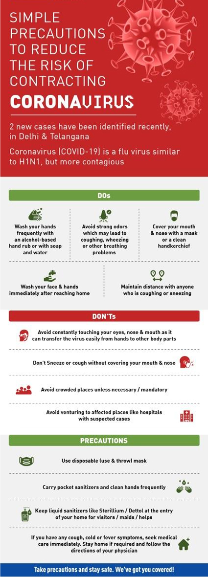 Here are a few simple precautions to take which can help you reduce the risk of CoronaVirus. Buy a health insurance policy get protection from CoronaVirus with IndusInd General Insurance.